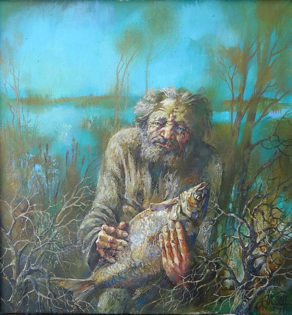 The old man and fish. 2011. Canvas,oil. 50x50 cm.